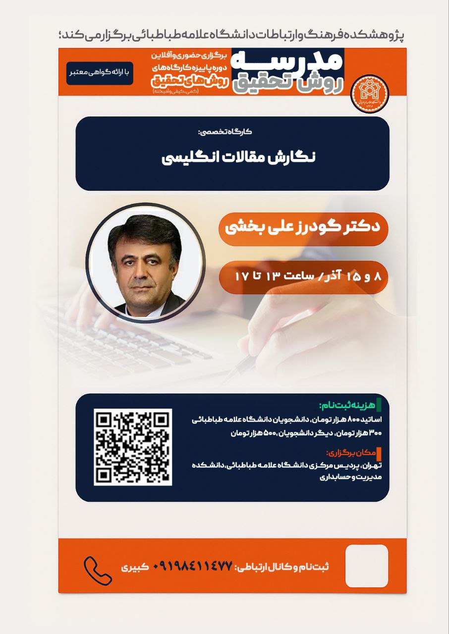 نگارش مقالات انگلیسی تاریخ : ۱۵ آذر ۱۴۰۴ محل برگزاری : تهران، پردیس مرکزی دانشگاه علامه طباطبایی، دانشکده مدیریت و حسابداری